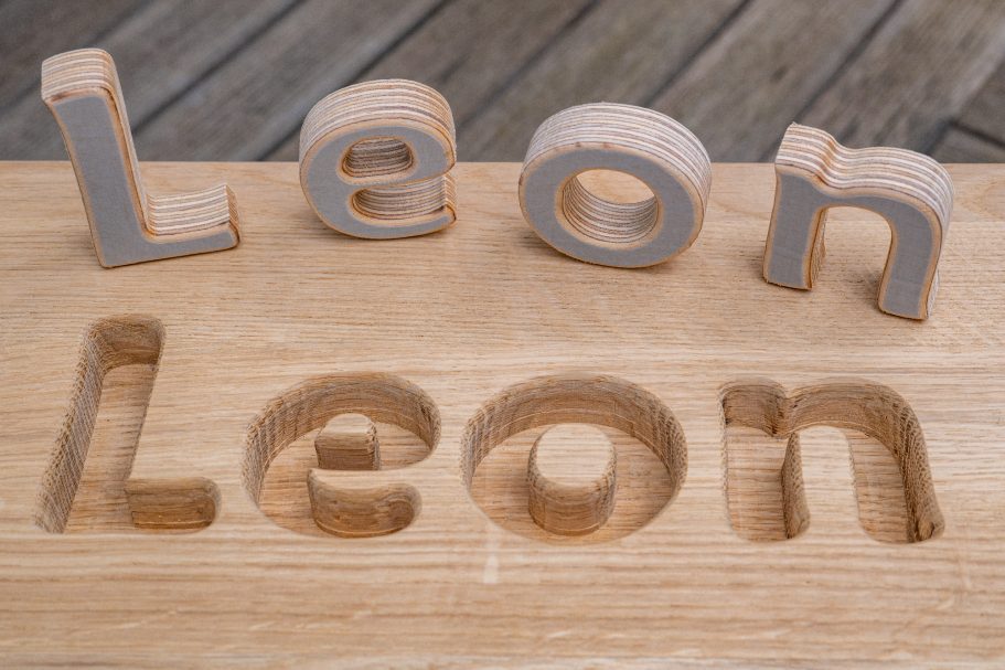 Holzbuchstaben aus beschichtetem Multiplex wieder eingelegt.